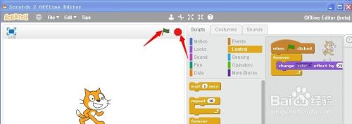 点绿旗开始执行程序,点按红色按钮停止程序的执行。