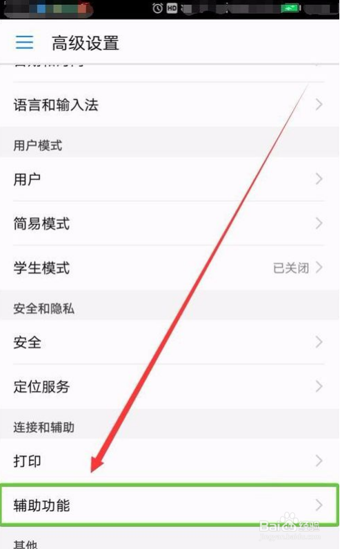 在高级设置界面,我们点击打开辅助功能按钮,进入辅助功能设置界面,
