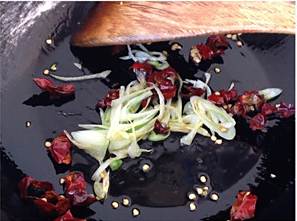炒锅加热倒入葵花籽油,油热放入干红椒爆香,加入葱花煸炒出香味,倒入白菜帮大火翻炒。
