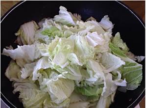 白菜炒至变色变软后,加入菜叶继续翻炒,炒至白菜八成熟。