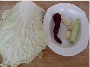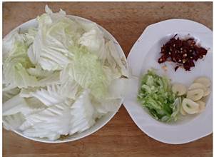 切好的白菜装盘备用,干红椒用剪子剪成小块,大葱、蒜切片装盘;将所有的调料白糖、鸡精、精盐、陈醋、生抽、蚝油放入小盆里,加少量水调匀备用。
