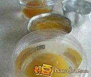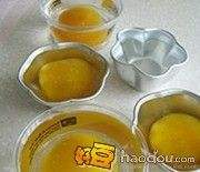 将融化的果冻汁倒入模具中七分满,加入黄桃块或水果丁。