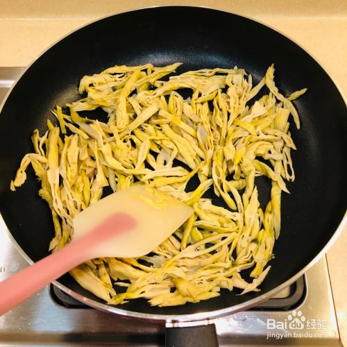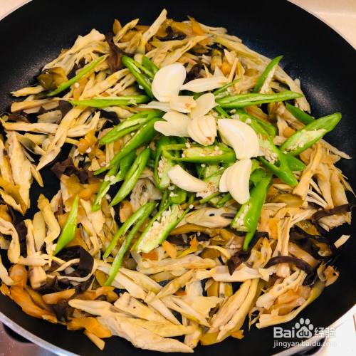 锅里加油,烧热,先加笋干翻炒