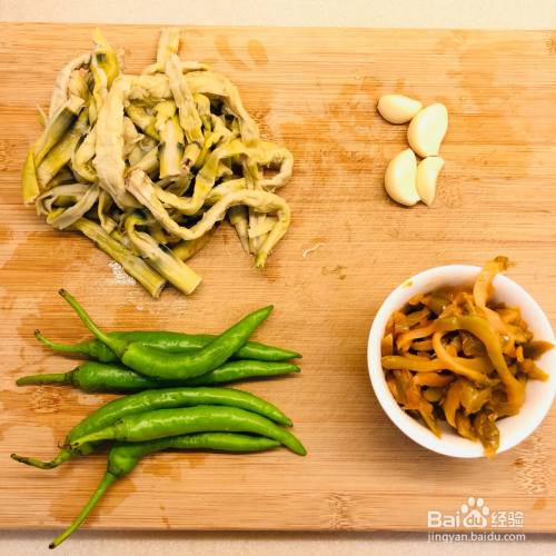 笋干和杭椒斜切,蒜瓣儿切片。