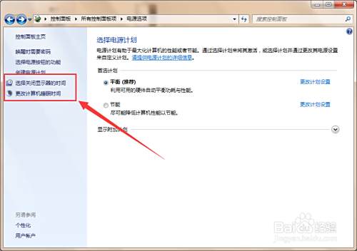 第四步,点击左侧“选择关闭显示器的时间”或者“更改计算机睡眠时间”,进入到编辑计划设置页面。