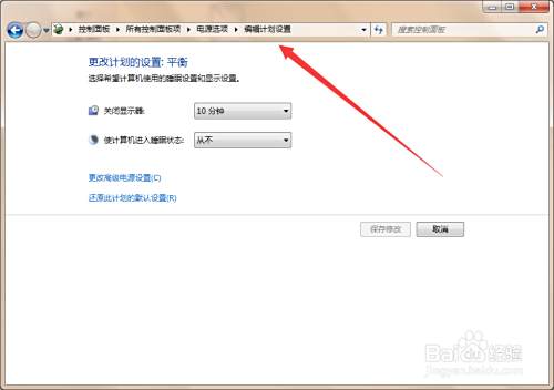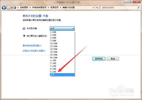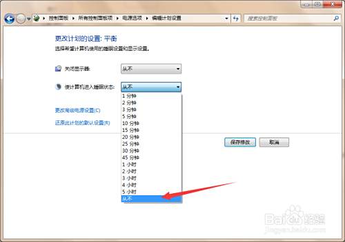 第六步,接着将“使计算机进入睡眠状态”设置为“从不”,然后点击保存修改即可。