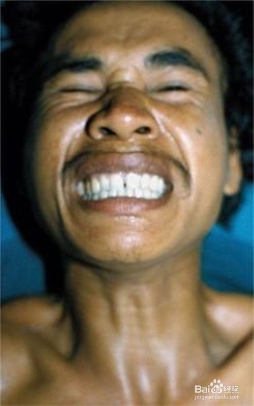 患者出现面肌、颈项肌、背腹肌、四肢,咀嚼不方便,张口困难,随后牙关紧闭。面部表情出现痉挛,使病人出现苦笑表情。