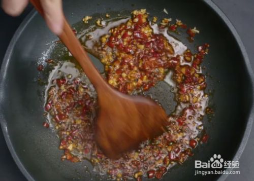 锅中加入适量的油,五成油温倒入蒜末爆香,随后把准备好的剁椒倒入锅中,适当翻炒一分钟