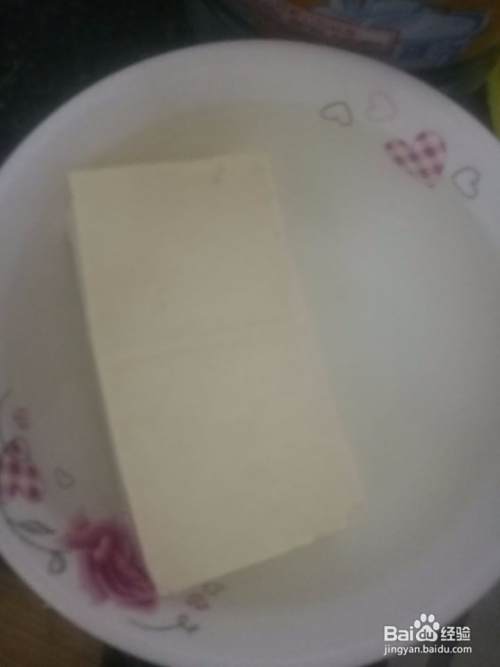 将水豆腐放在水里浸泡一下,准备好西红柿、青椒、姜蒜等辅助食材。