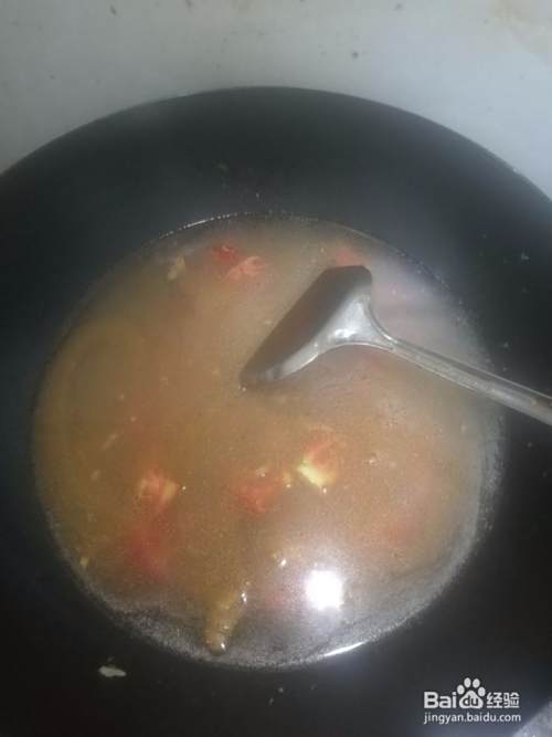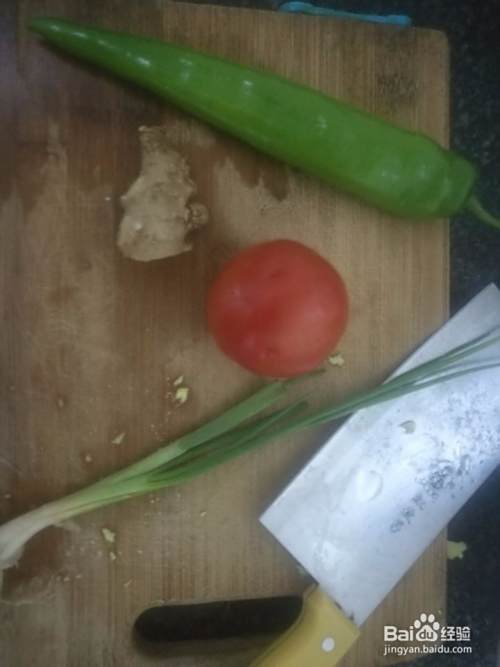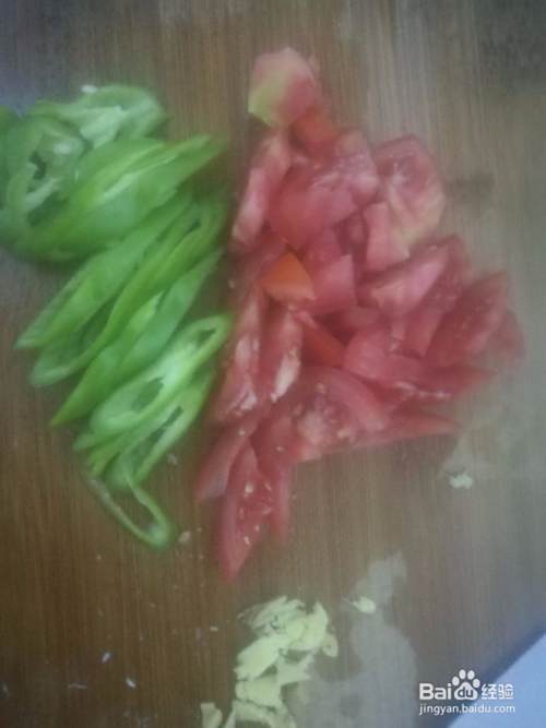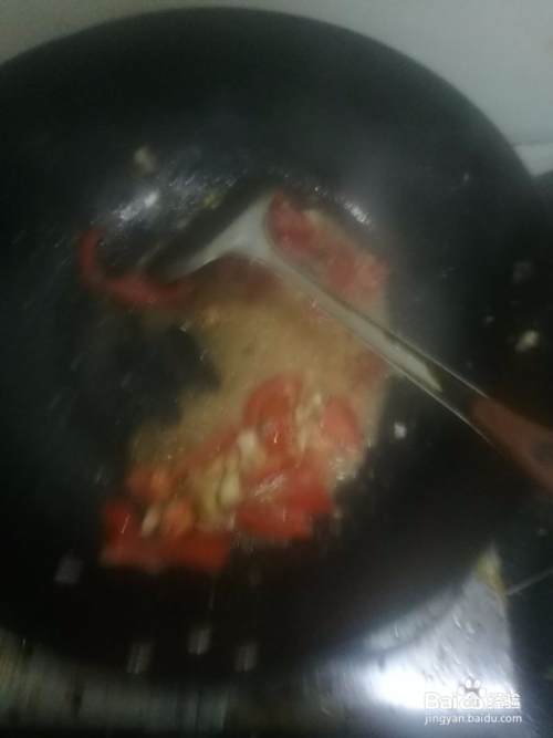 再倒入适量的油,将西红柿、青椒、姜蒜一起放进去翻炒,加入适量的水。