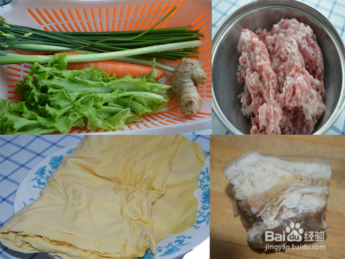 猪五花肉打成肉馅备用,干豆腐、熟五花肉备用,韭苔、胡萝卜洗净备用。