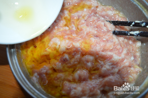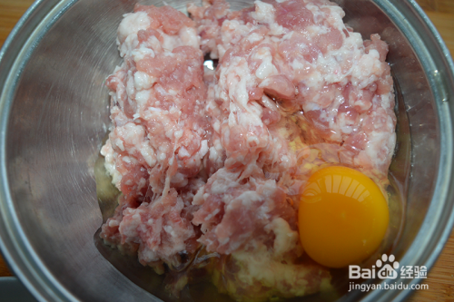 肉馅中打入鸡蛋拌匀。