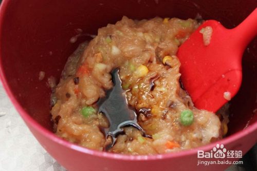 把大葱和姜切成碎末加入到肉馅中继续搅拌,然后放入酱油、盐、少许白胡椒粉继续搅拌均匀。