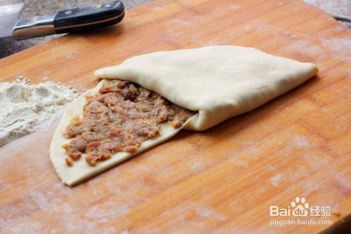 把提前拌好的肉馅按面团的份数也分成等量,取出一些放到擀好的面片上铺匀,然后把放好肉馅的面片从上到下对折在从左到右对折,然后用擀面棍把肉饼团擀开,不要擀的太用力。