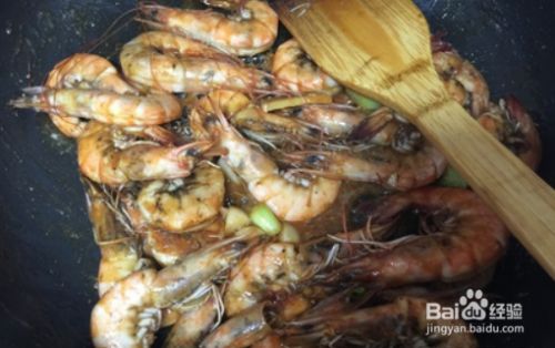 2.将油锅烧熟后,加入切好的生姜与蒜末,待溢出蒜香之后,迅速加入清洗干净的大虾,不断翻炒,直至大虾的颜色发生改变。
