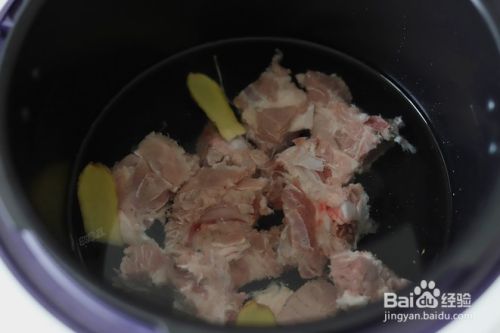 锅中放入冷水,将脊骨放入锅中,加入几片生姜。