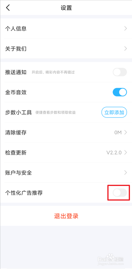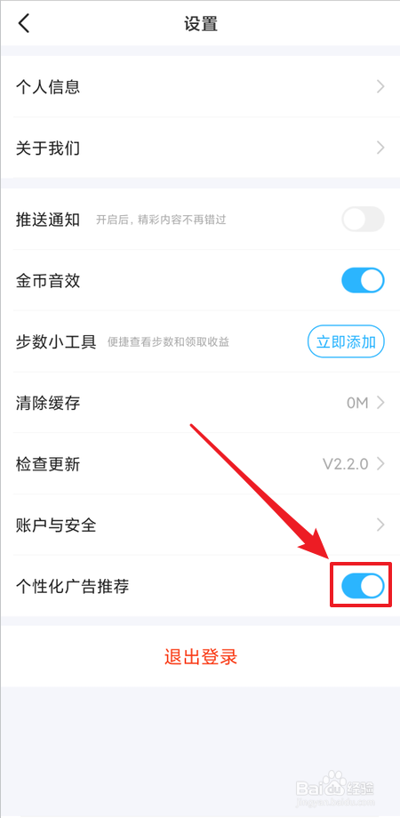 打开设置界面后,点击【个性化广告推荐】右侧打开的滑块开关即可。