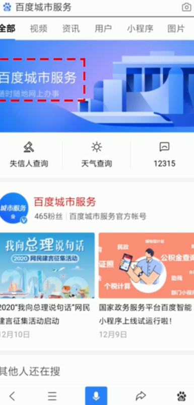 进入手机“百度”APP,输入“百度城市服务”,点击“搜索”。