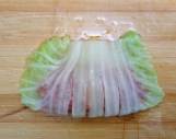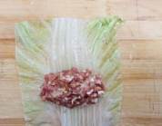 取些肉馅放在划好白菜帮上。(肉馅多一些,蒸出来的佛手会更饱满)