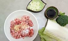 肉馅中加入葱花、姜末、 食盐、鸡精 、香油 、生抽、搅拌均匀,加入水淀粉。
