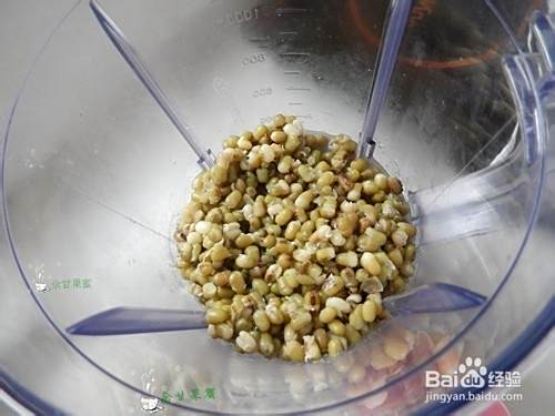 稍微凉一下,加入适量绿豆在料理机杯中。适量加点水。