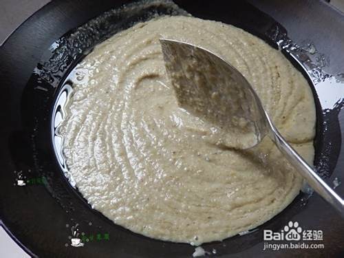 全部搅拌后,加入锅中,加入部分糖和油,没缘锅边倒入。
