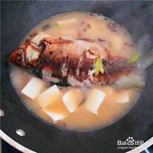 再调入适量的料酒、盐、白糖和醋,打入豆腐块,继续小火炖煮20分钟,鱼肉软烂、豆腐入味、鱼汤浓郁即可出锅装盘。