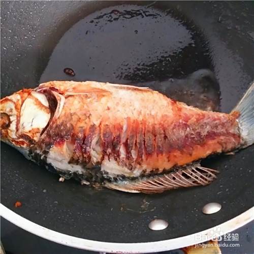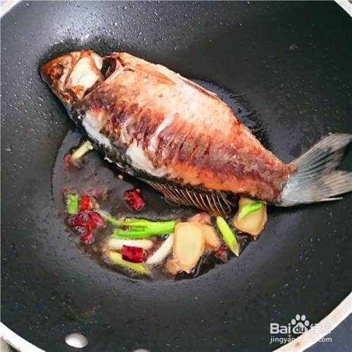 锅中倒入适量的油烧到六成热,放入鲫鱼煎到一面焦黄色,再翻到另一面煎至焦黄色。