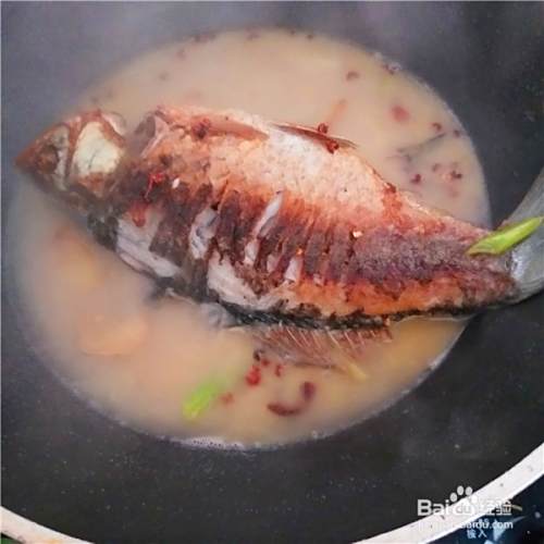 加入适量的热水,正好没过鱼身,加入一勺猪油大火煮5分钟,煮到汤呈奶白色。
