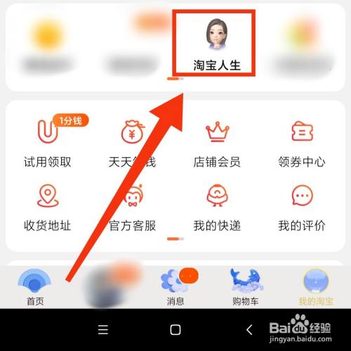 打开淘宝APP, 选择页面右下角的我的淘宝,再点击页面中的淘宝人生按键。
