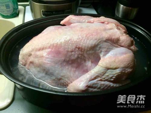 2将火鸡浸入盐水中,放进冰箱腌制24小时,中途翻身一次;