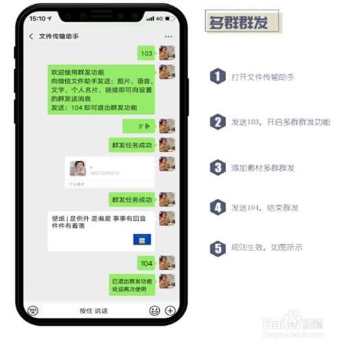 最后,在多群群发底部对话框内可以发送消息,就可以同步群发到多个群;除了电脑端可以群发,手机端也同样可以,需要利用与文件传输助手互动,向其发送查看帮助、发送103启动群发功能,任务结束后发送104退出即可。