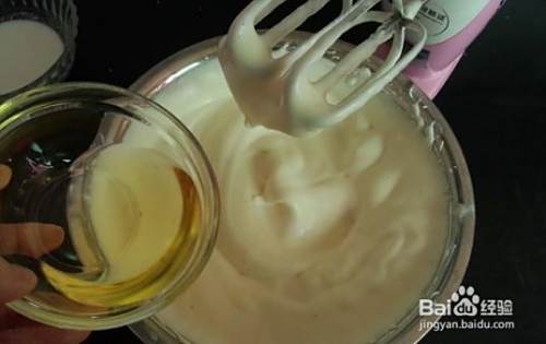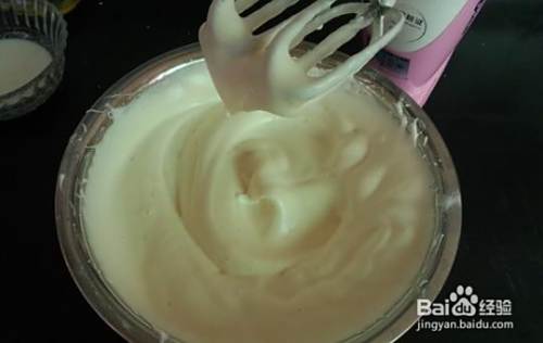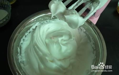 将蛋白打发至硬性发泡,提起打蛋器蛋白成竖起成三角形即成