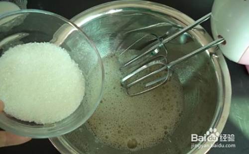 蛋白与蛋黄分离,将蛋白打发至粗泡,加入细砂糖