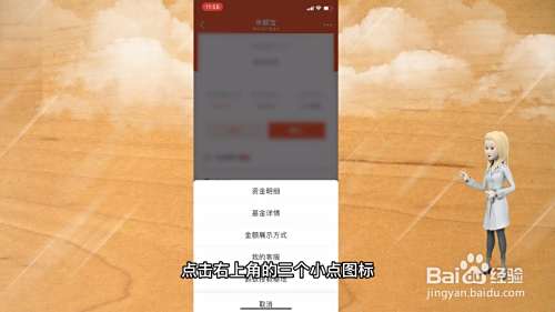 进入我的余额宝页面,点击右上角的三个小点图标,弹出选项后点击资金明细的选项。