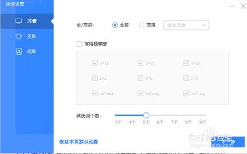 点击立即体验后,弹出并进入到输入法快速设置窗口,这里我们可以快速设置一下输入法的习惯、皮肤以及词库等。