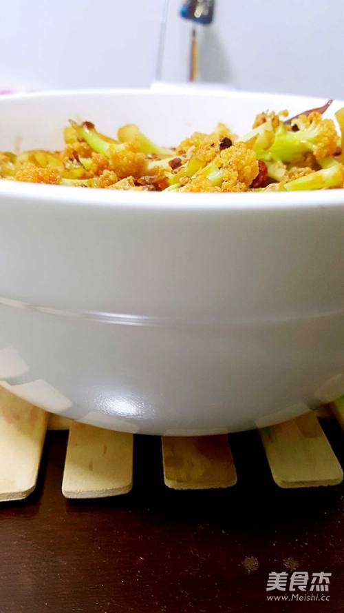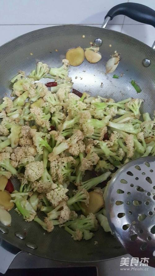 5菜花下锅,大火爆炒2分钟,至根部变成绿色。