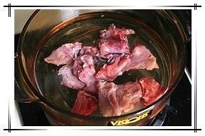 锅中做清水,兔肉凉水下锅焯透血沫,捞出待用。