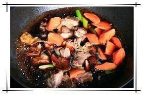 中放少许油煸香葱姜蒜,放入兔肉烹入绍酒,放入酱油翻炒均匀,加开水盖盖炖约半小时。