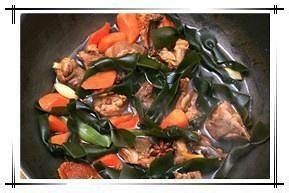 在炖熟的兔肉中加入海带结,加盐、胡椒粉调味大火收汁装盘时小油菜围边撒上香葱末即可。