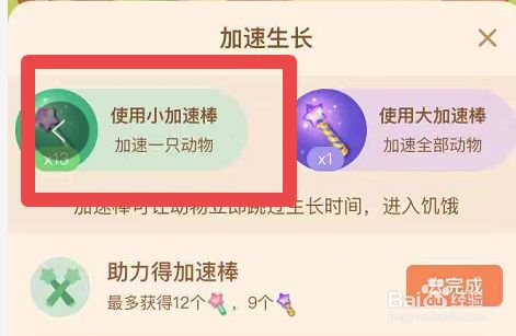 然后点击顶部的使用小加速棒按钮,这时候会自动隐藏起加速页面,但是在每一个小动物的头上都会显示一个加速道具,小加速棒每次使用只能加速一个动物的生长,所以这时候选择哪个小动物就会给这个小动物加速。