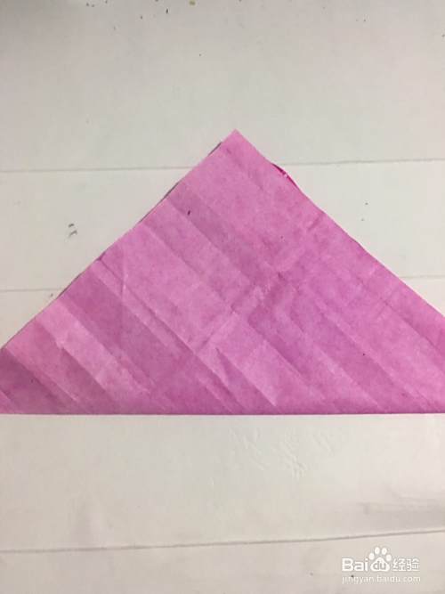 第一步 把一张16厘米X16厘米的正方形二红色彩纸 从下向上对角折叠整齐