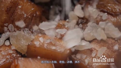 热锅起油,下姜片、八角、桂皮、香叶,入五花肉煸炒,加入料酒煮开,依次加入生抽、老抽、冰糖、沸水。