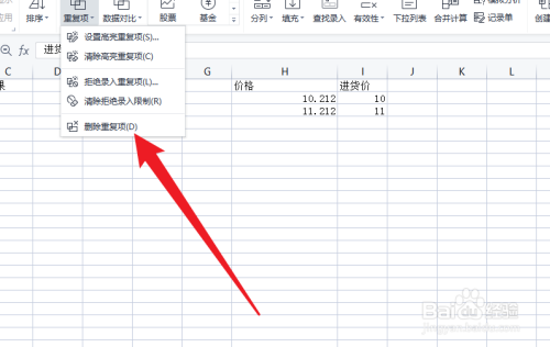 选中删除重复项数据,点击选择开始选项,点击选择重复项,点击打开删除重复项选项,点击删除重复项按钮完成删除。
