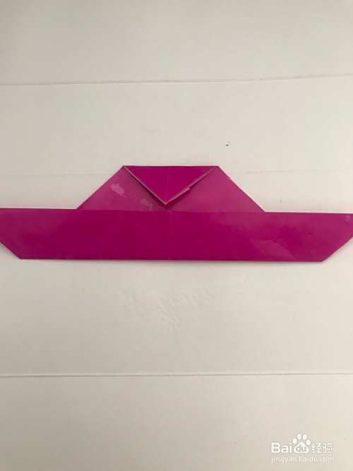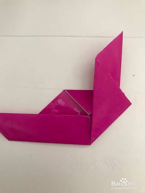 第五步 两边都向上沿中线折叠好之后 再把它上下翻过来平放 然后掀起右下角向上沿边折倒 再按图示左边留出一小段向下回折 右下角同样折叠
