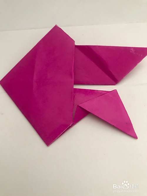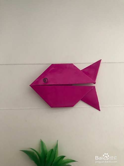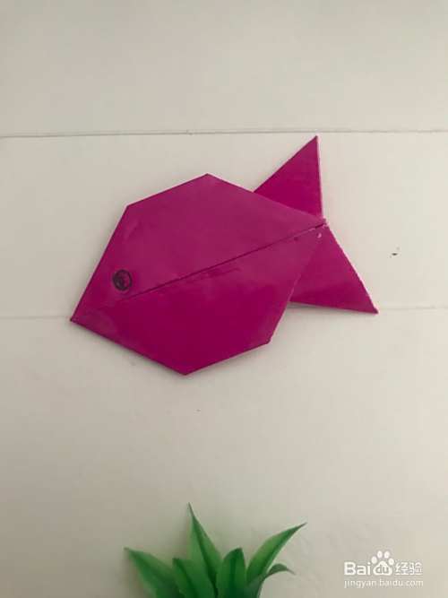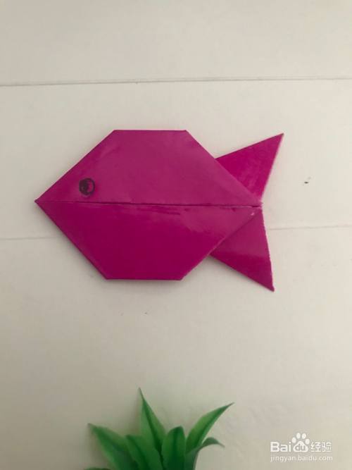 第六步 折叠完尾部之后 再把胸鳍部位的上下尖角都向里折叠至背面 然后再画上小鱼的眼睛 再调整一下 一条可爱的海洋小鱼就折叠完成了