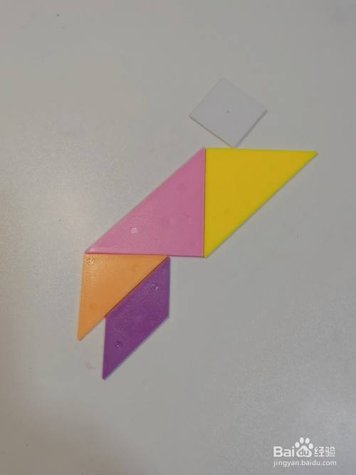 拿出一个紫色平行四边形板放在橘色中号三角形板的下面,如图所示。