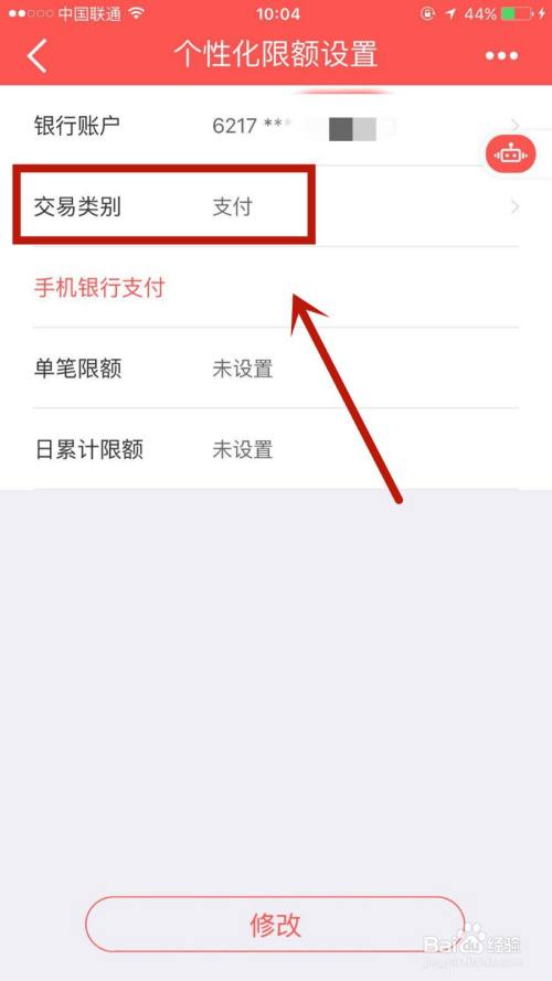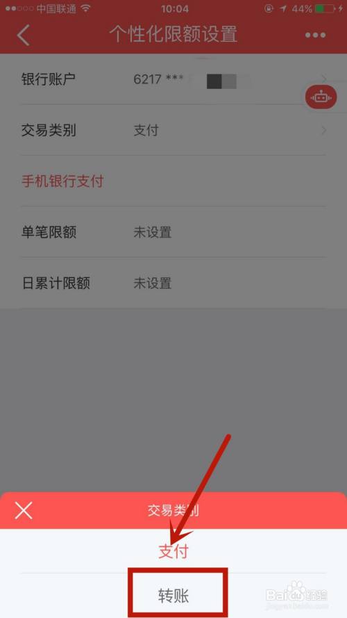 3.点击进入个性化限额设置,再进入页面的交易类别,并选上转账选项。