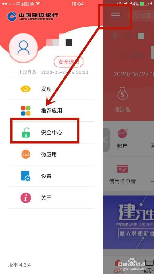 打开中国建设银行软件后,点击首页左上角的 三 小标,再点击进入安全中心选项。