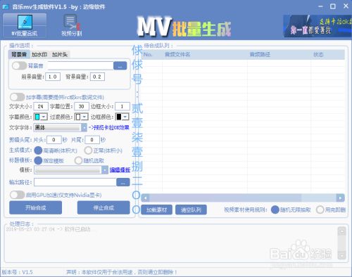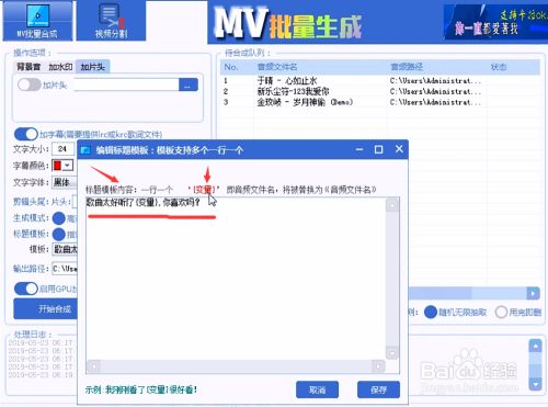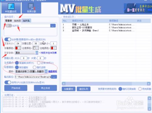 素材导入后,设置自己所需的要求,可以设置字幕颜色大小等,以及可以添加片头,水印等,可以设置音乐MV合成后的名字,根据自己的要求去变量改变,一行一个